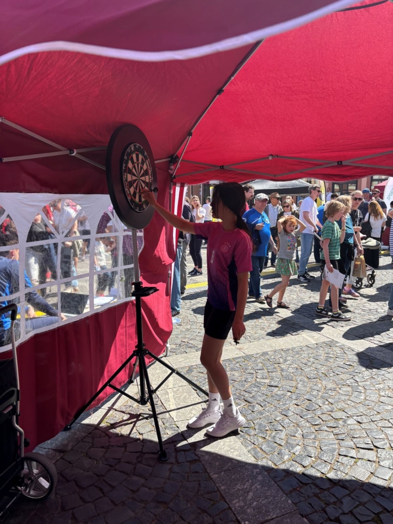 An unserem Stand konnten Groß und Klein beim Steeldart ihre Treffsicherheit testen, am Rudergerät „1000e Meter“ zurücklegen und auf der Airtrackmatte Purzelbäume schlagen. Anlässlich des 165. Vereinsgeburtstags hatten wir ein besonderes Ziel: 165 Purzelbäume sollten gesammelt werden. Dieses Ziel war schnell erreicht – am Ende kamen sogar noch deutlich mehr Purzelbäume zusammen, die vor allem von begeisterten Kindern „erpurzelt“ wurden. Die älteren Turnerinnen nutzten die Matte, um ihr Können mit Überschlägen, Sprüngen und akrobatischen Elementen zu präsentieren. Für alle mutigen Mitmacher*innen gab es ein kleines Give-away.